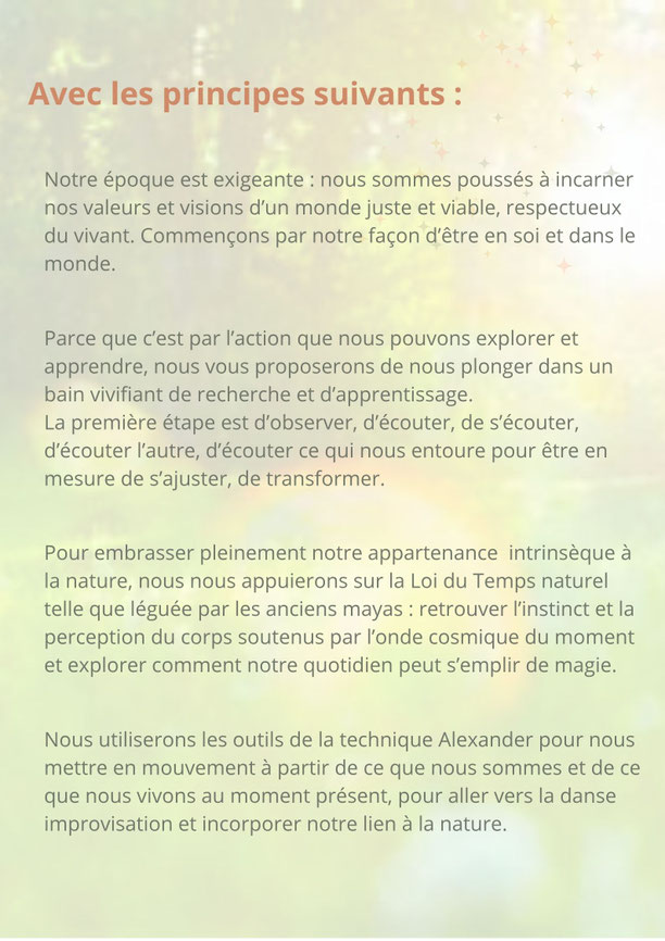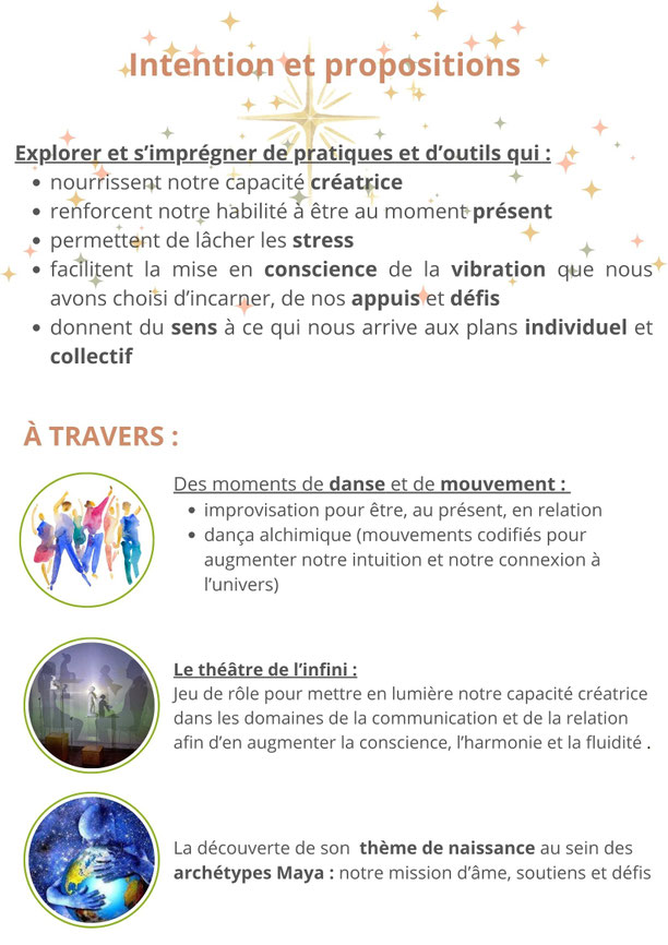 Dans tous les stages, nous explorons la Loi du Temps Maya et pratiquons des mouvements alchimiques.
